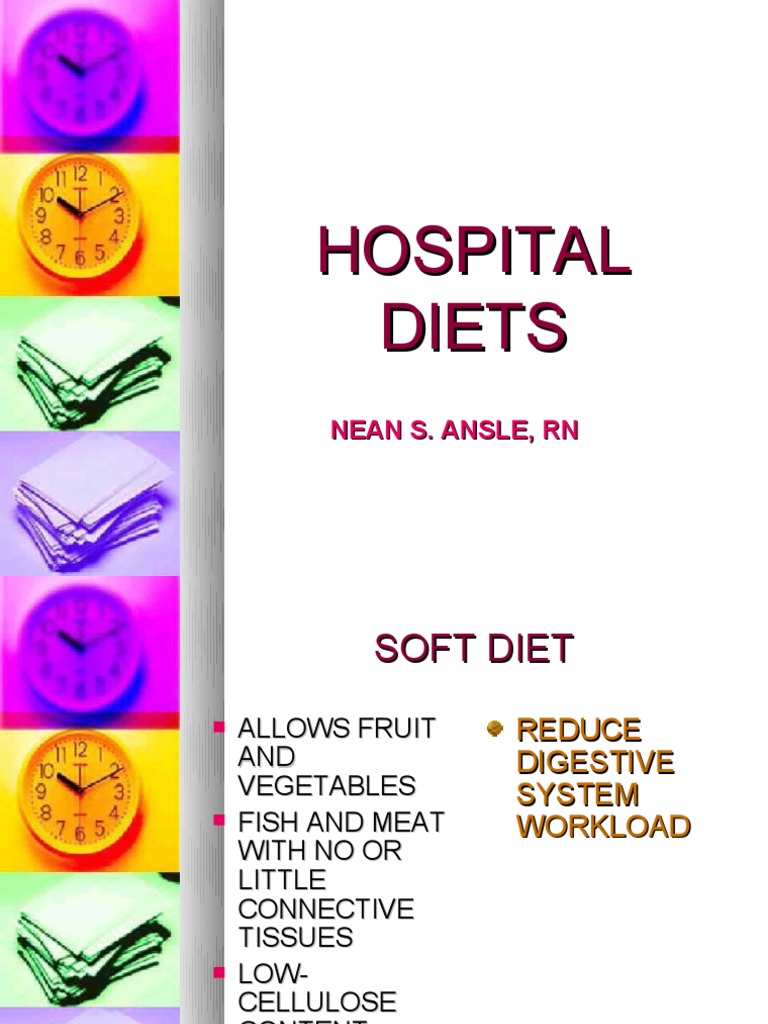 Standard hospital diets Soft Food Diet In Hospital A soft food diet refers to food that is soft in texture, low in fiber and easy to digest. Dysphagia can be one or more of the following: The mechanical soft diet focuses on altering the texture of foods to make them easier to chew and swallow. This leaflet gives you (and anyone involved in preparing your food) advice about. Soft Food Diet In Hospital.