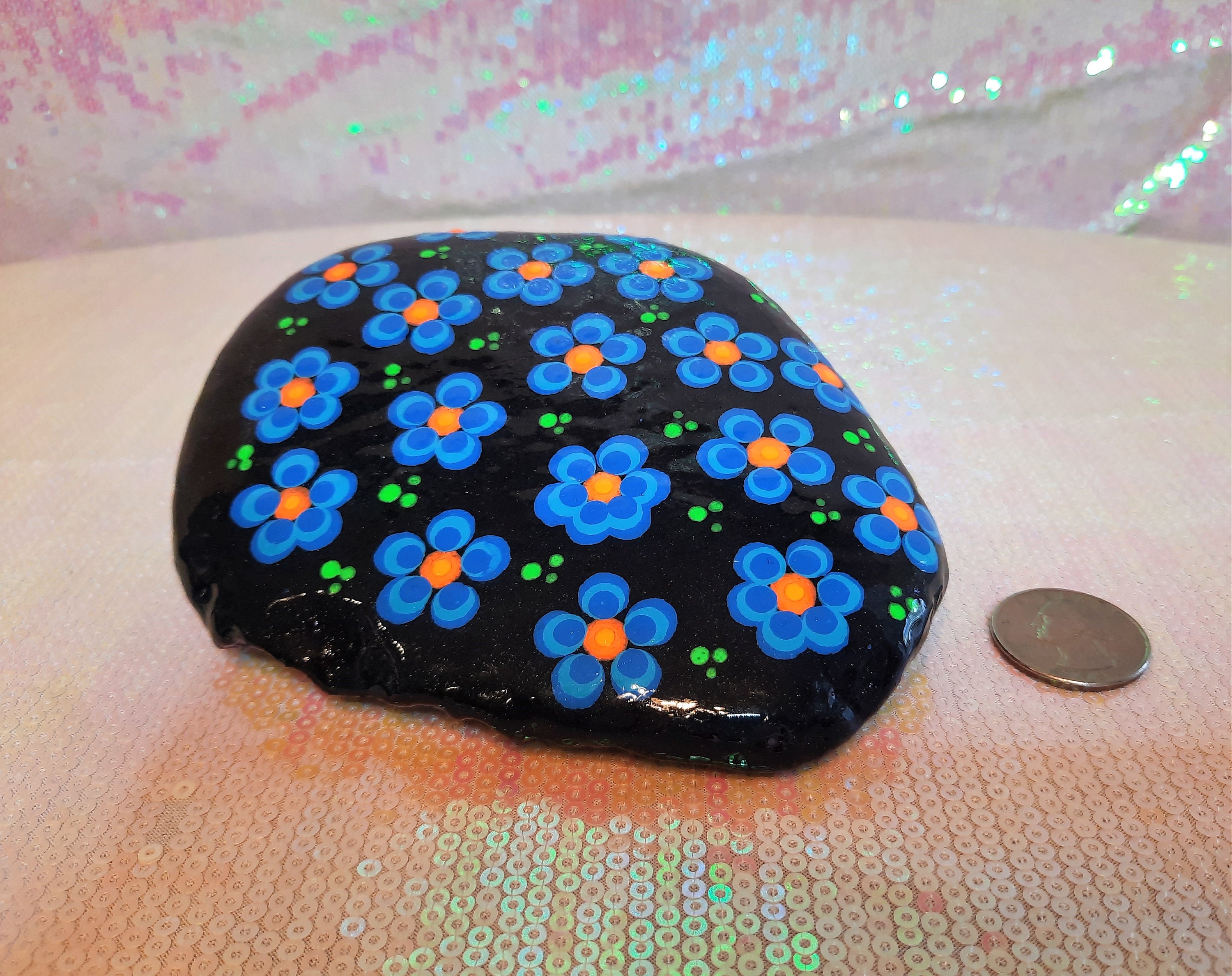 Blue Handpainted Flower Garden Rock / Stone, Sealed w/ Resin, Dot
