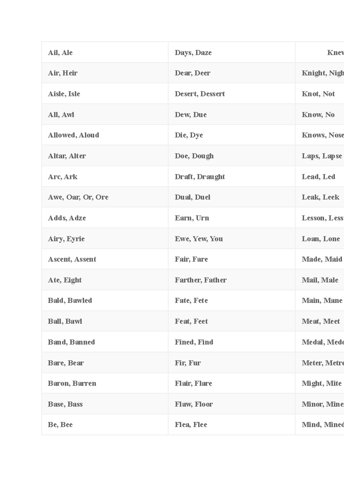 Homophones Ail, Ale Days, Daze Knew Air, Heir Dear, Deer Knight, Nigh