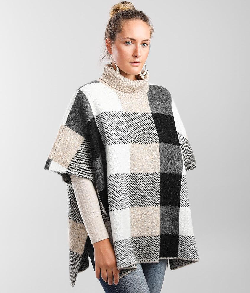 Buckle Black Plaid Poncho Sweater Women's Sweaters in Grey Sand Buckle