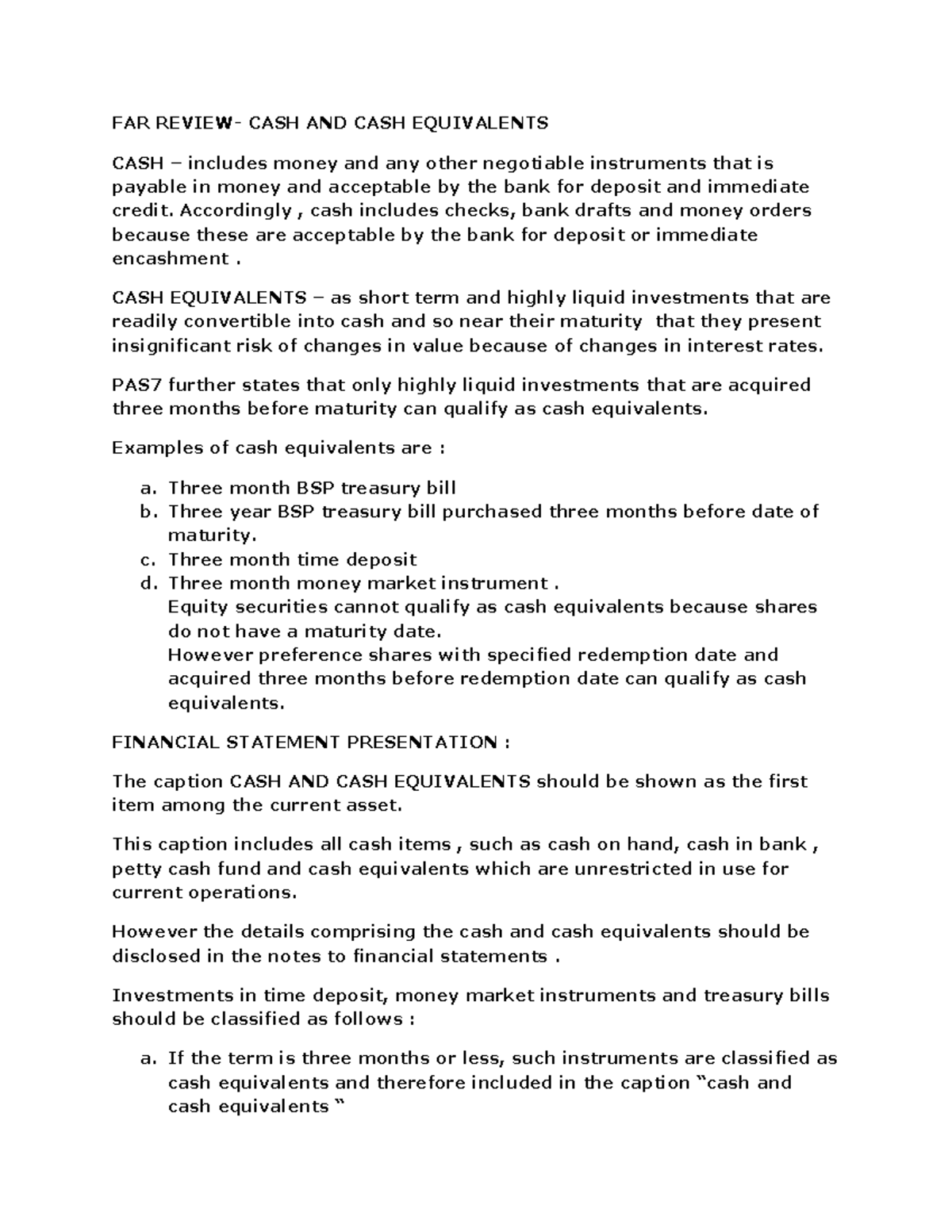 FAR Review CASH N CASH Equivalents PART 1 FAR REVIEW CASH AND CASH