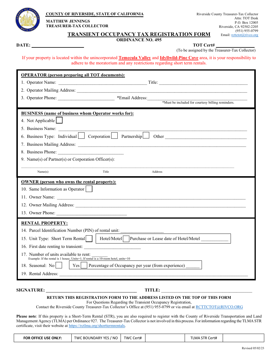 County of Riverside, California Transient Occupancy Tax Registration