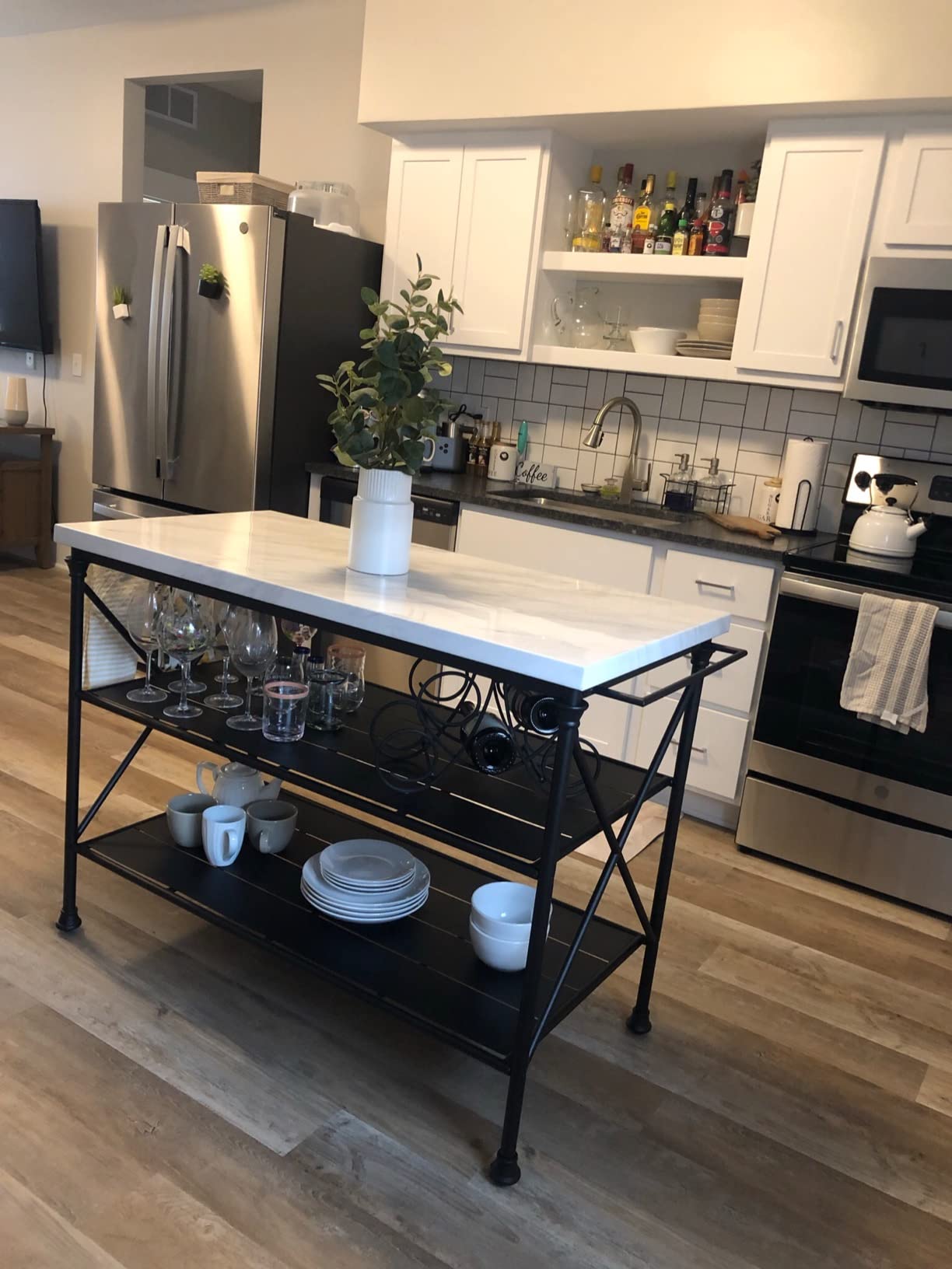 Crosley Furniture Madeleine Kitchen Island, Steel with Faux Marble Top Madeleine Kitchen Island Island base constructed of sturdy steel with a matte black finish. White faux marble table top for a stylish. Two large open shelves provide. Inspired by the french industrial revival, the madeleine kitchen. View your kitchen in vrno middlemen Inspired by the french industrial revival, the madeleine kitchen island brings a stylish aesthetic to your kitchen with its beautiful. Inspired. Madeleine Kitchen Island.