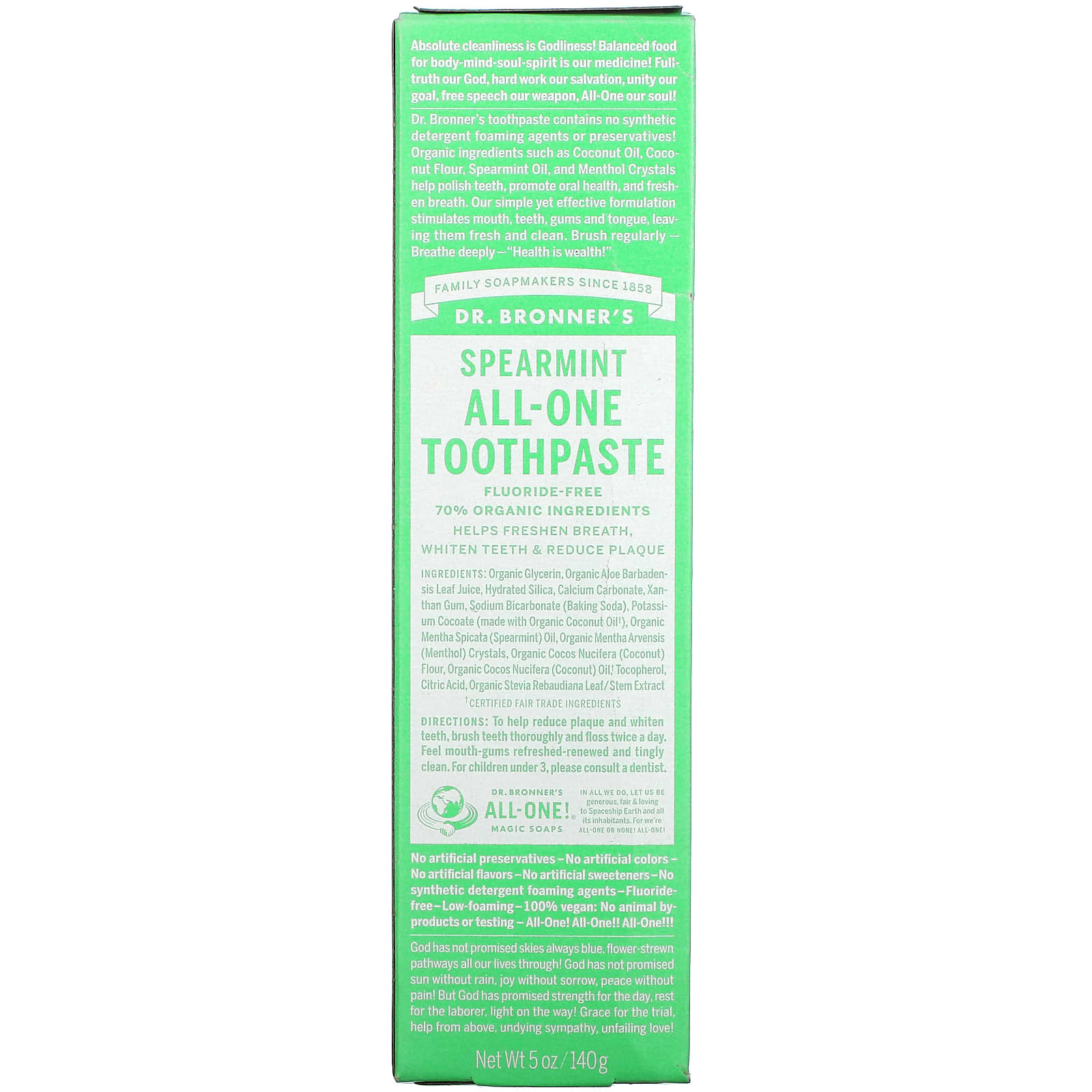 Dr. Bronner's Toothpaste (AllOne) Spearmint 140g Dr Bronner's Toothpaste Spearmint 10k+ visitors in the past month No artificial colors or flavors, carrageenan, preservatives, synthetic sweeteners or. Dr Bronner's Toothpaste Spearmint.