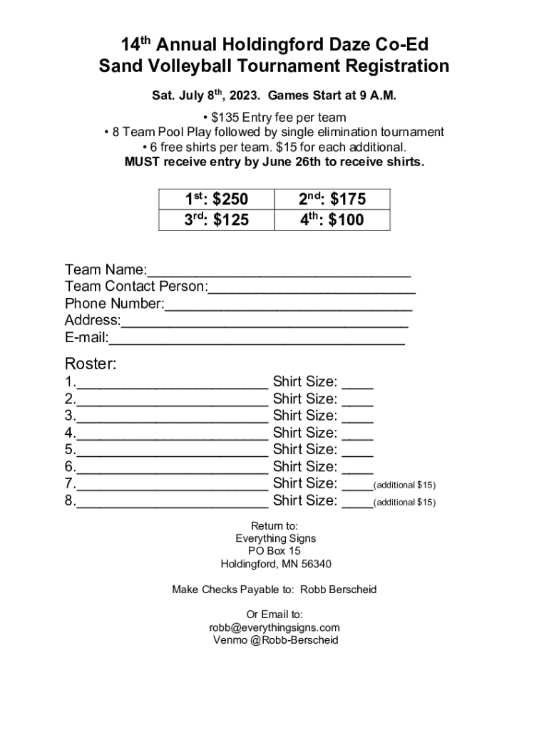 Fillable Online 14th Annual Holdingford Daze CoEd Sand Volleyball