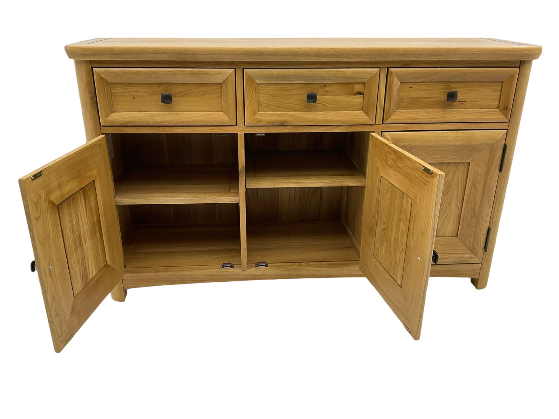 Solid light oak sideboard, fitted with three drawers and three Light Oak Sideboard Cupboards This light oak large sideboard comprises of one large cupboard with 3 doors, creating a three cupboard effect and 3 separate drawers with brushed silver. This light oak large sideboard comprises of one large cupboard with 3 doors, creating a three cupboard effect and 3 separate drawers with brushed silver. This beautiful solid wood sideboard is masterfully crafted from authentic. Light Oak Sideboard Cupboards.