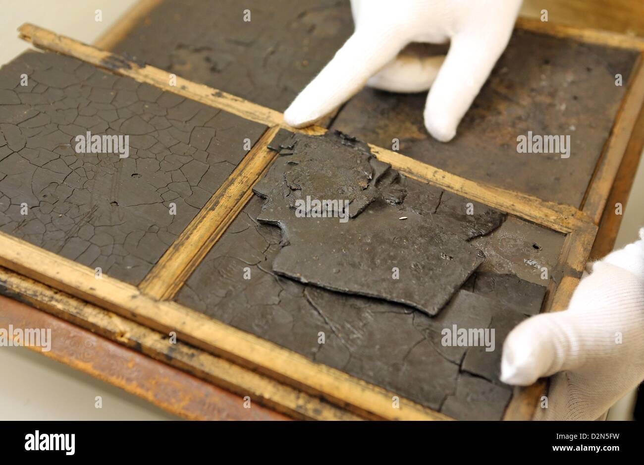 A heavily damages book of wax tablets from the 17th century is presented at the State Archives