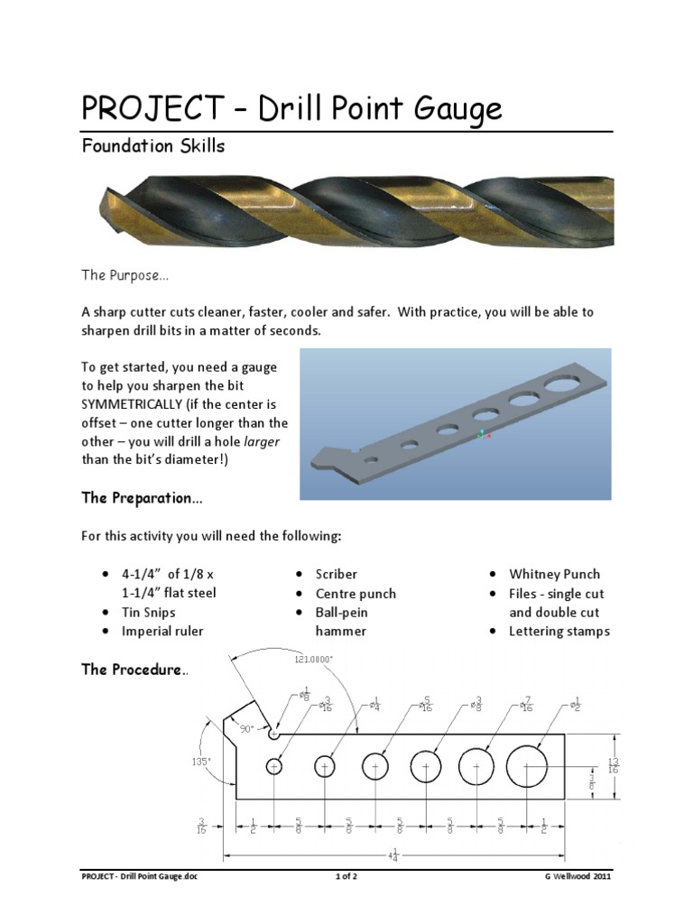 PROJECT Drill Point Gauge PDF Drill Gauge Project To get started, you need a gauge to help you sharpen the bit. Picture of my drill gauge: It is important to use the correct size and type of drill bit for the material being drilled, and the correct angle. Research drill bit terms and features for use. Simulate a manufacturing process through the production of a drill grinding gauge.. Drill Gauge Project.