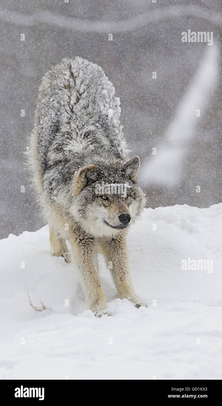 Grey wolf (Canis lupus) stretching before playing in the snow