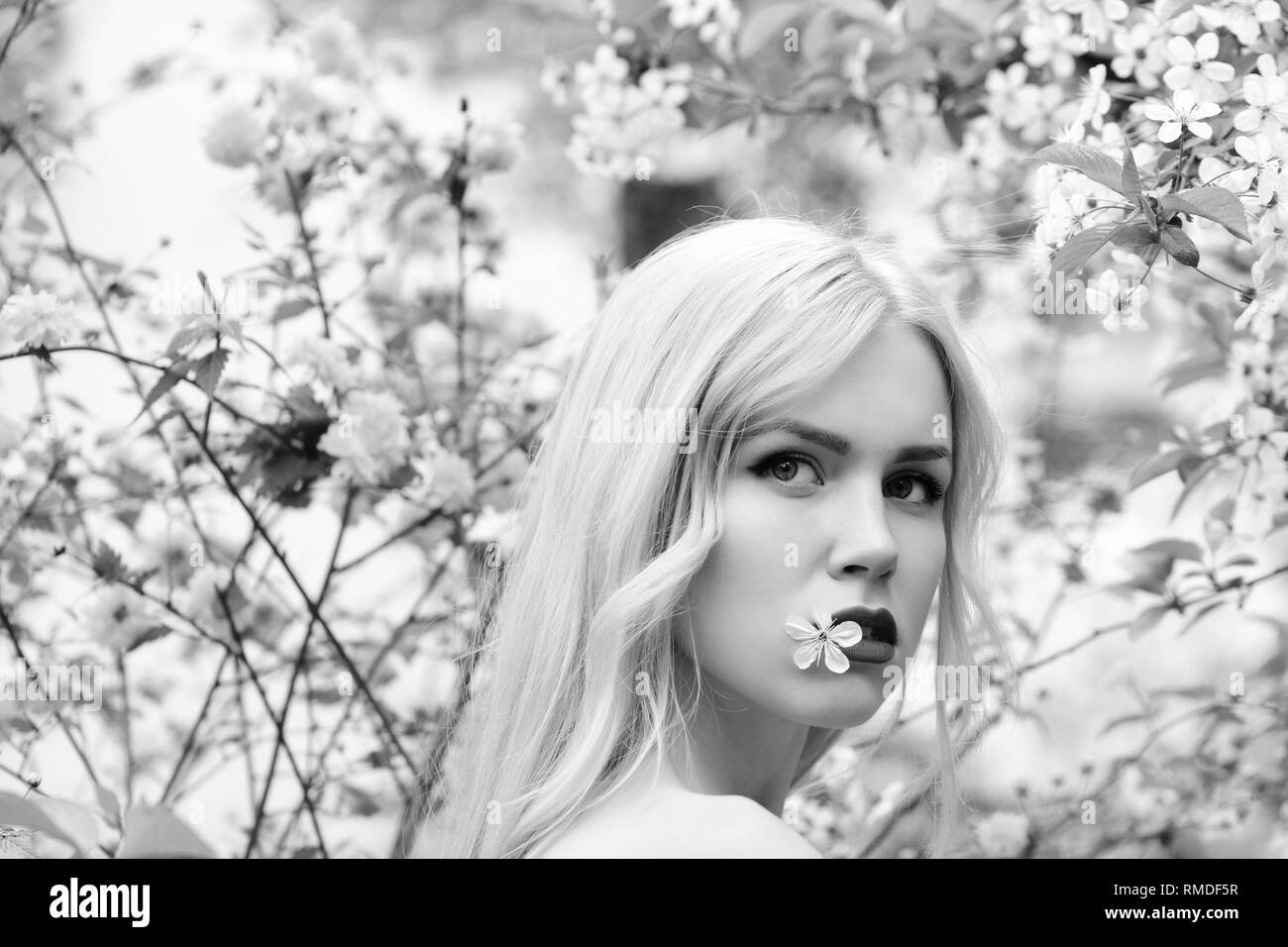 Garden cherry blossom tree woman Black and White Stock Photos & Images