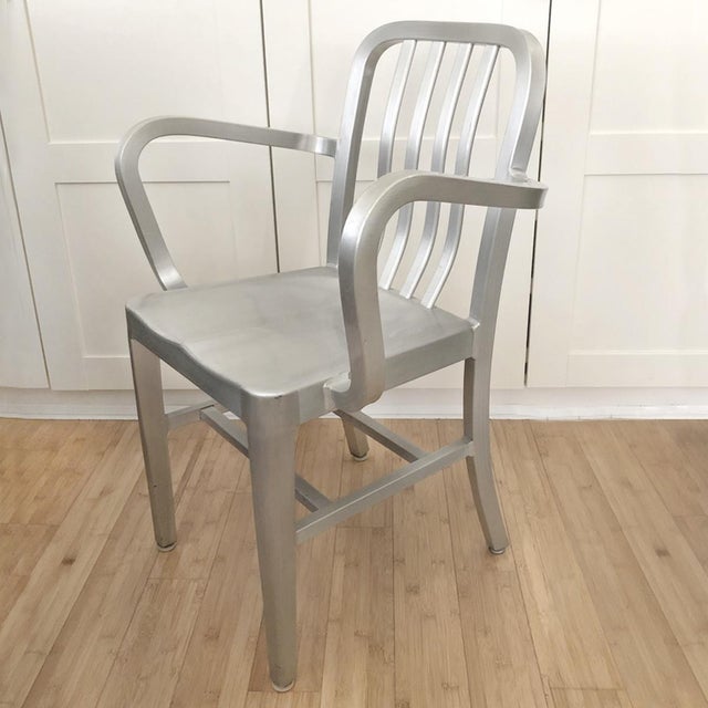 Emeco Outdoor Navy Aluminum Dining Arm Chair with Maharam Ledger Navy Chairs Emeco navy wood by emeco, 2019 our iconic navy chair shape, in the warmth of wood. Each chair is made from at around 170 plastic bottles. add an upholstered seat pad for extra comfort. navy officer by jasper morrison. Available in a range of fabrics and. Originally designed for the us navy in the 1940's, jasper morrison has.. Navy Chairs Emeco.
