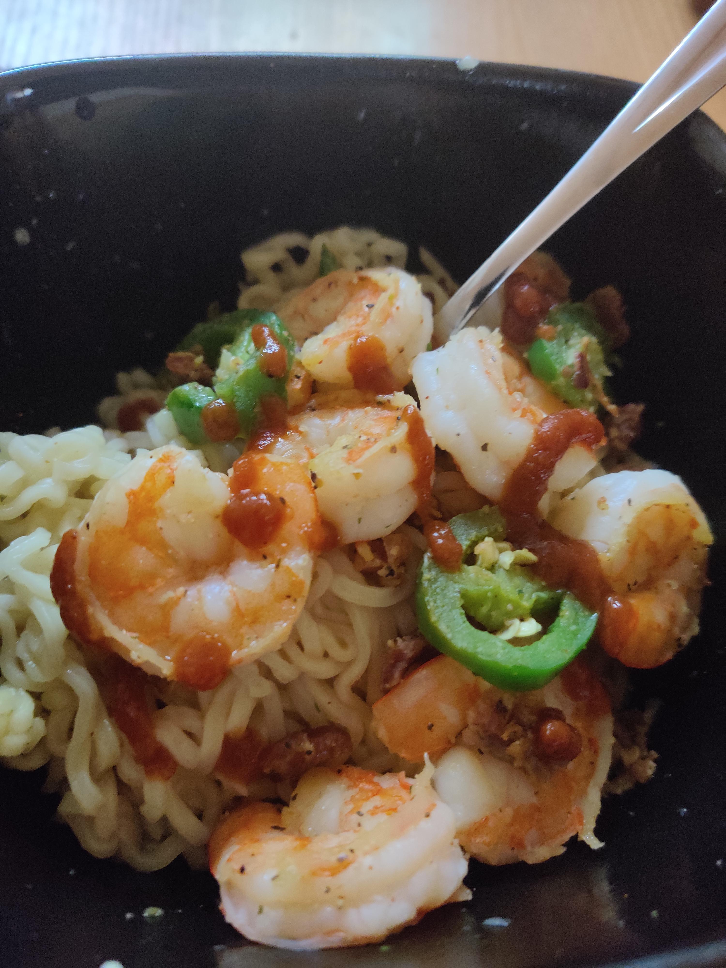 Ramen with bacon, bell peppers and shrimp, topped off with ghost pepper