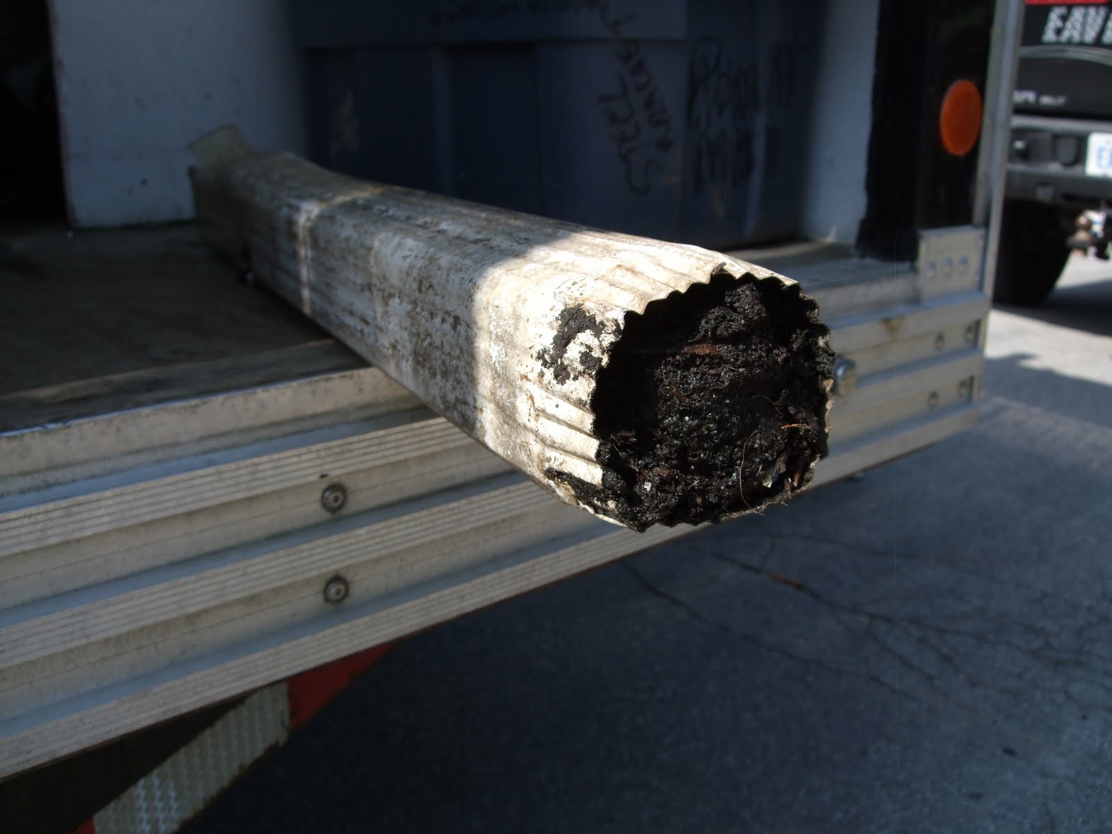 side view of Down pipe plugged with natural debris