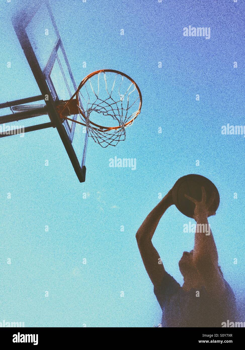 Teenage boy shooting a basketball. Outdoors shot, natural light, grainy