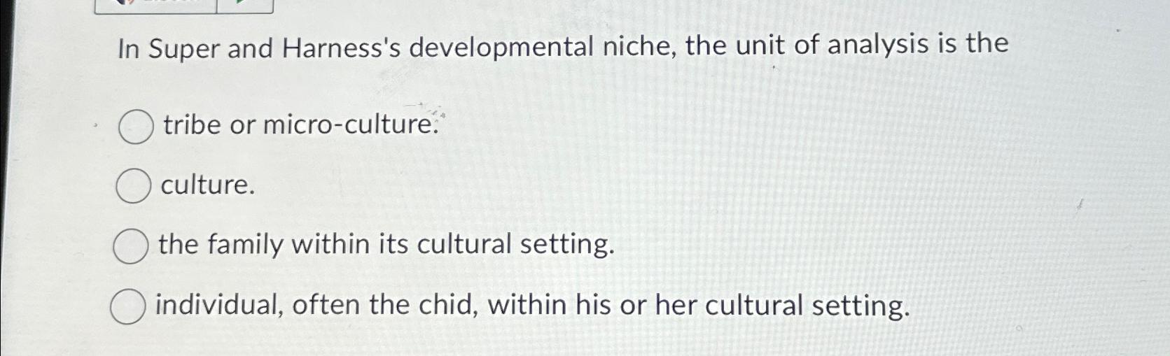 Solved In Super and Harness's developmental niche, the unit What Is Developmental Niche The developmental niche has three components: The developmental niche is a theoretical framework that describes the interconnected factors that influence a child's development,. A child's developmental niche is a complex system of interactions among individual, family, community, and societal factors, with culture. Reviews early formulations of the interface between culture and introduces the concept of the developmental niche as a. What Is Developmental Niche.