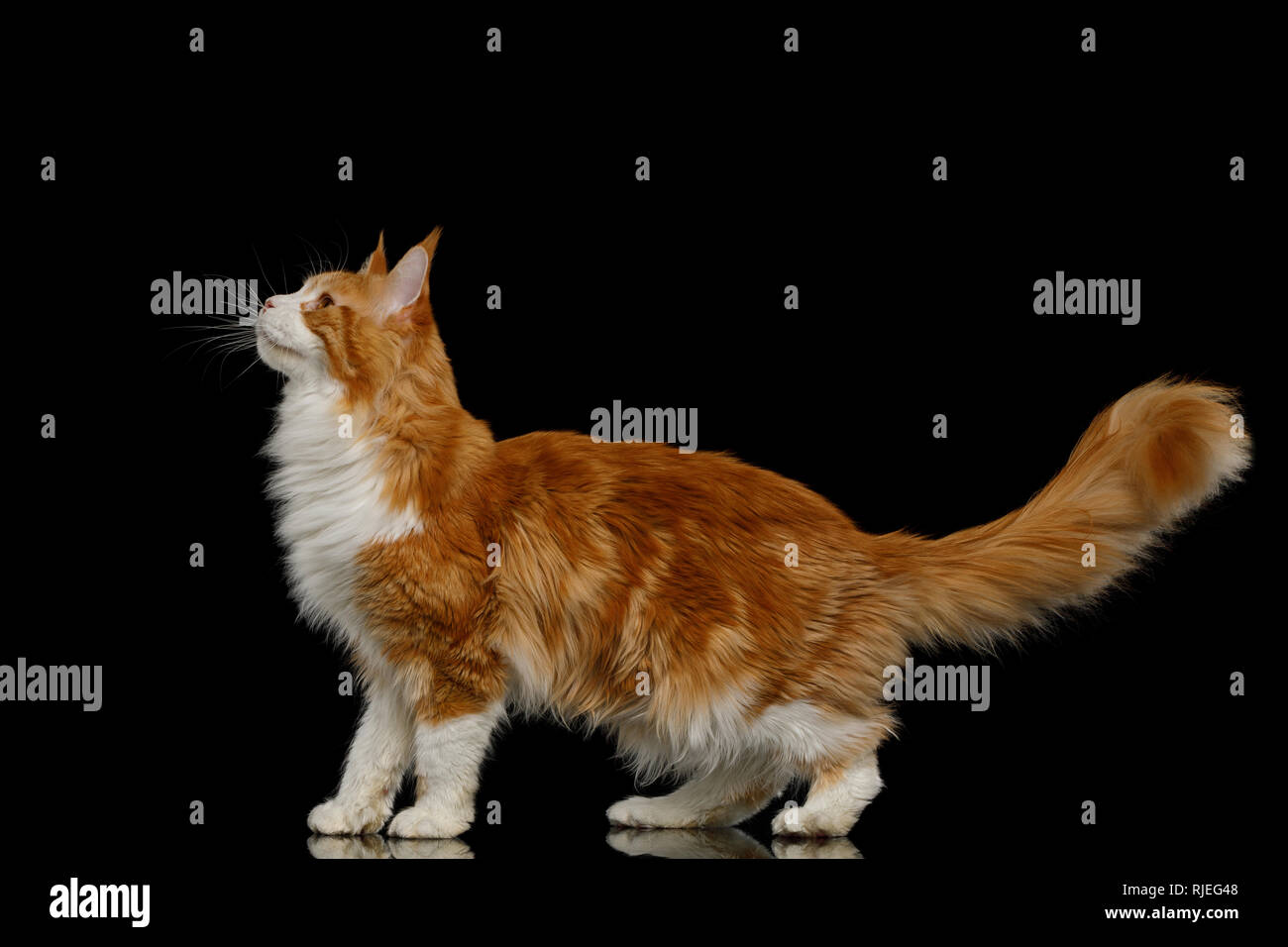Playful Ginger Maine Coon Cat, Standing and Looking up Isolated Black