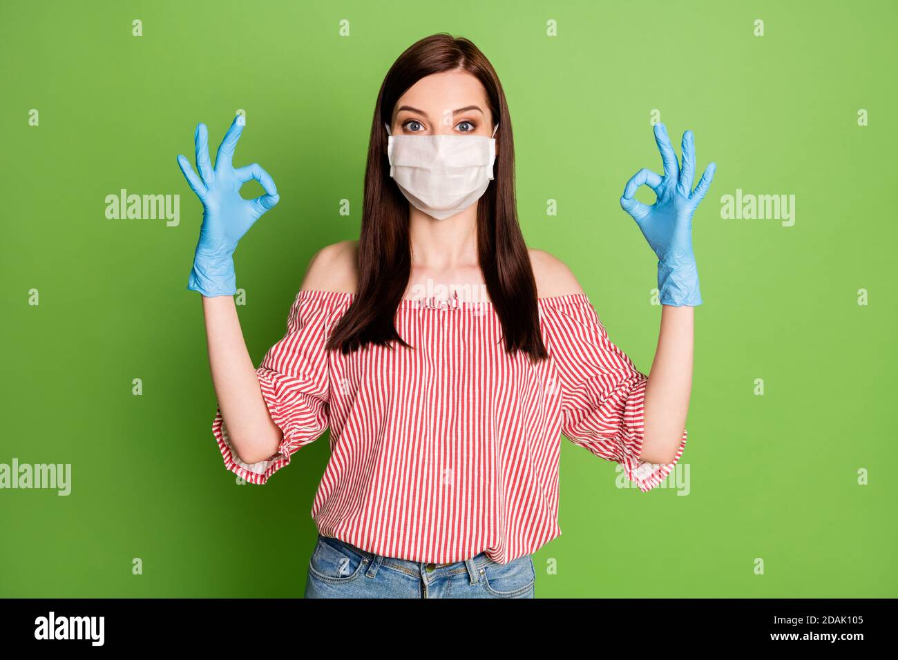 Photo of girl in medical mask show okay sign approve covid protection