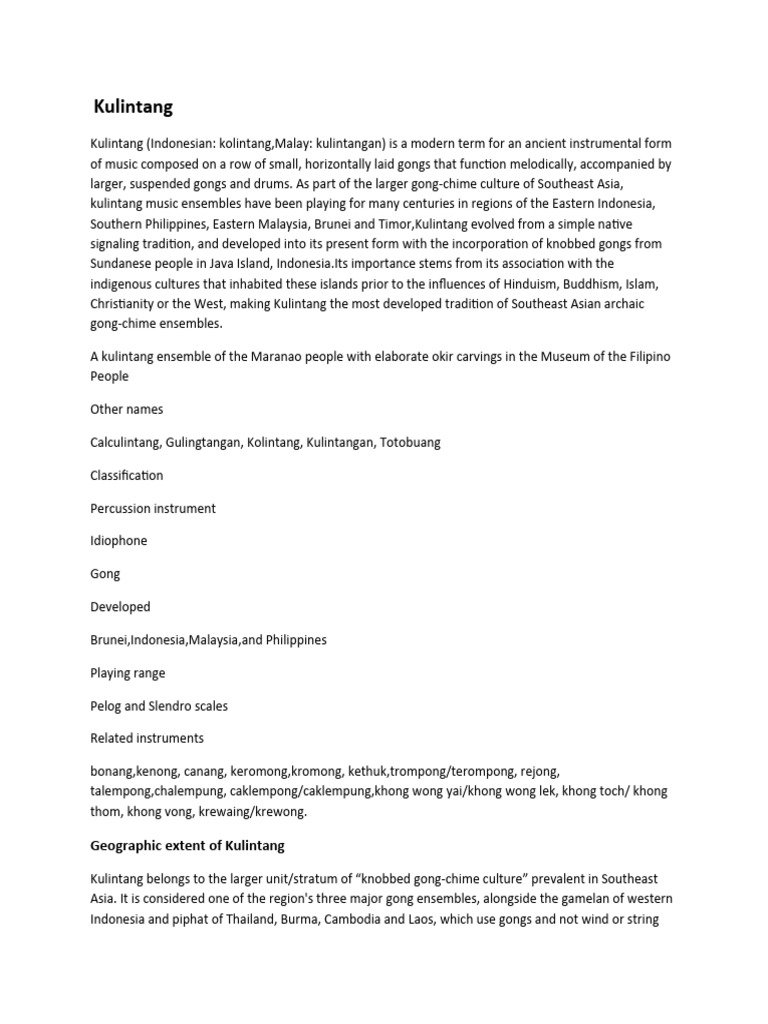 which among the following describes the kulintang ensemble?A. A large, deeprimmed gong Description Of Kulintang This traditional musical instrument holds immense cultural significance. Kulintang is a woman’s instrument; One of the most iconic instruments that originated from the philippines is the kulintang. Traditionally, among various groups, kulintang ensembles are composed of mostly women. Kulintang, originating in the southern philippines, is a musical tradition blending islamic and indigenous influences among moro tribes. The kulintangan, a traditional. Description Of Kulintang.