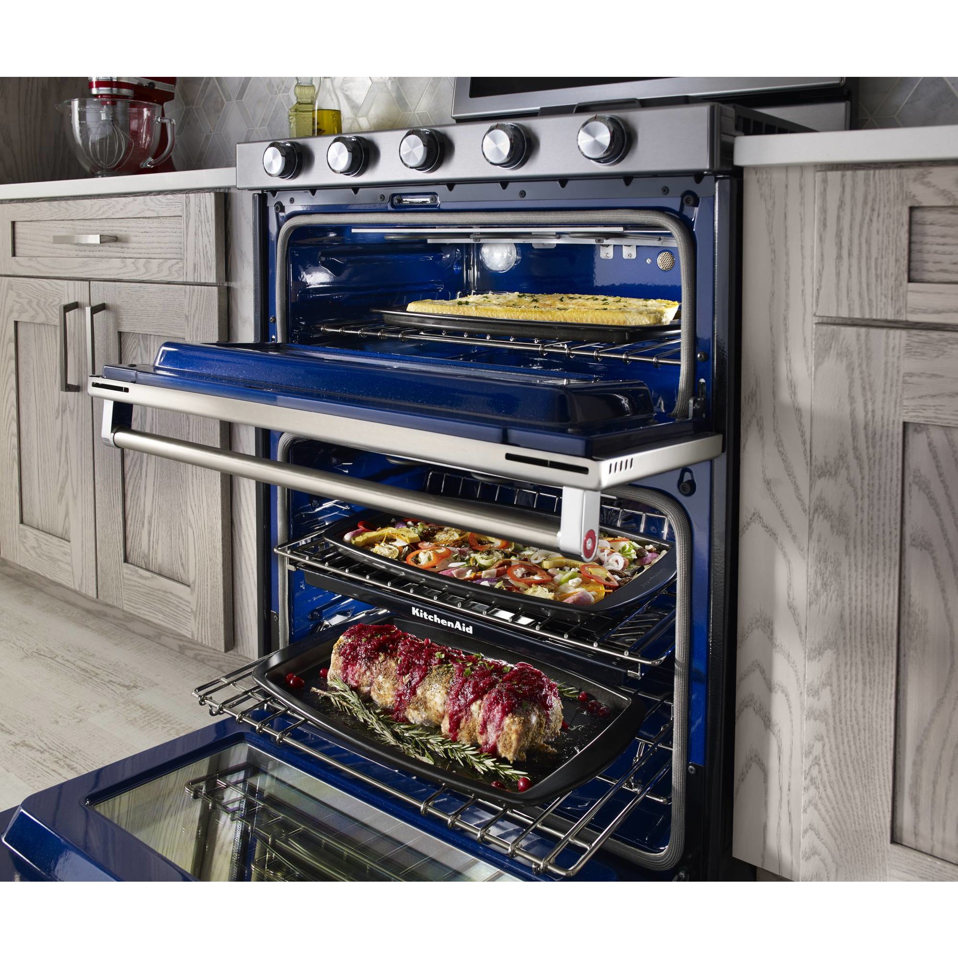 Kitchenaid 30 Stainless Steel Dual Fuel Double Oven Range Kfgd500Ess . Shop now for the guaranteed lowest prices on double oven gas ranges from. 30 inch freestanding dual fuel range with 5 sealed burners, 17,000 btu, 6.7 cu. This powerful dual fuel double oven range can satisfy the culinary needs of the most. 30 inch freestanding double oven convection gas range with 5. This double oven range features satin textured. Buy the kitchenaid kfgd500ess double oven gas ranges at p.c.