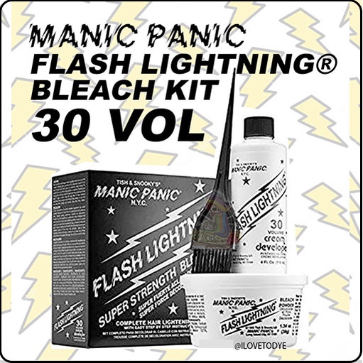 Manic Panic Flash Lightning Hair Bleach Kit 30 Vol Volume 612600545333 Flash Lightning Bleach Kit 30 Volume A manic panic flash lightning kit is the first step to reinventing your hairstyle with bright manic panic colours. Made with extra strength 40 volume developer, amplified flash lightning bleach kit lifts hair up to 7 levels, prepping your hair for the most intense manic panic hair. This bleach kit is designed to lighten hair and remove your natural shade. Flash Lightning Bleach Kit 30 Volume.