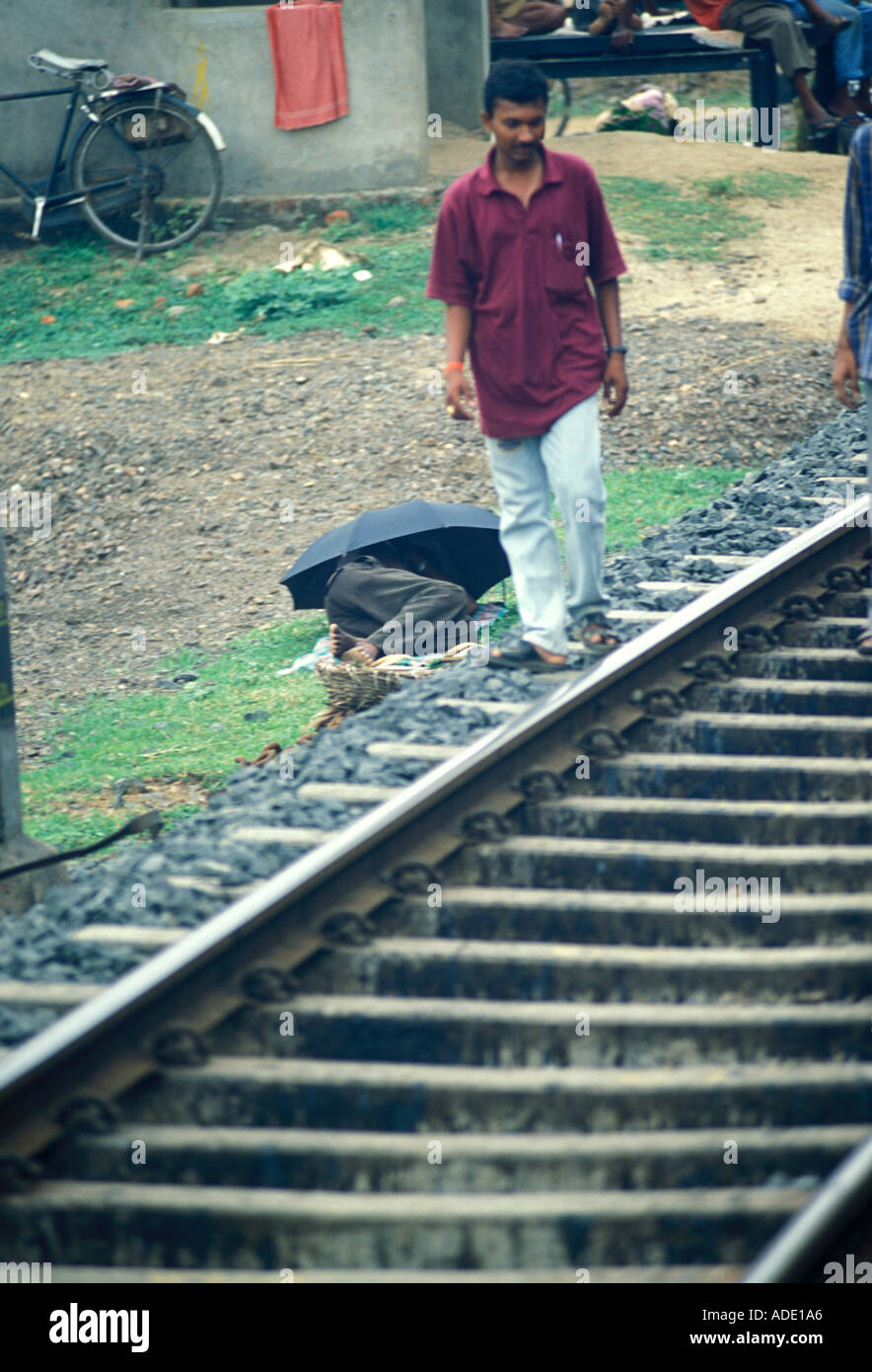 East Indian Man walks by person lying beside railroad track in India at