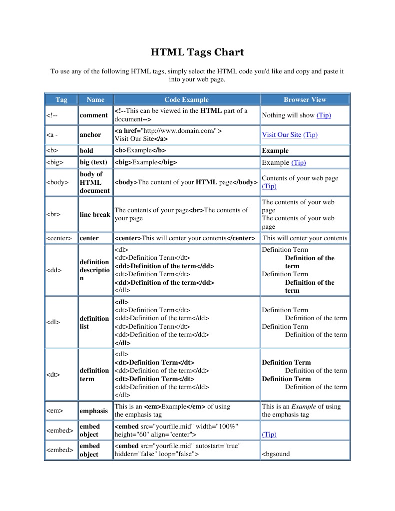 HTML Tags Chart Html Page
