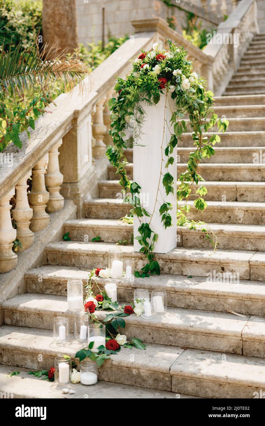 White candles in glass jars next to the reception stand on stone steps