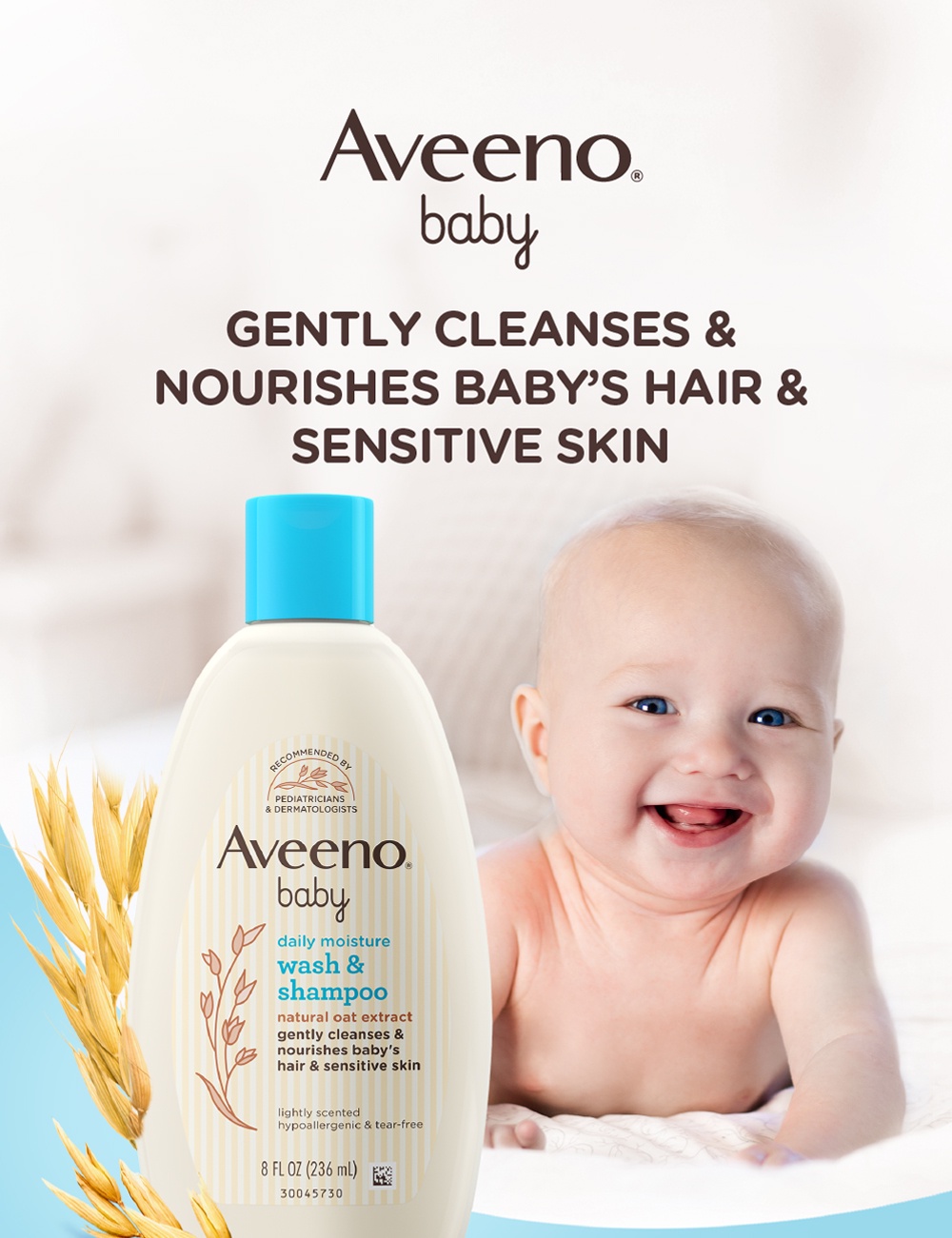 Aveeno Baby Daily Wash & Shampoo 236ml Newborn, For Sensitive Baby Aveeno Baby Shampoo Sulfate Free Formulated without soap, parabens, sulfates, or phthalates. Baby shampoo is designed specifically using gentle, mild formulas for sensitive baby skin and eyes. Aveeno ® baby shampoo uses natural oat. Gentle enough for everyday use to help keep baby's skin and hair soft and smooth. The rich, lathering baby body wash and shampoo formula. Aveeno Baby Shampoo Sulfate Free.