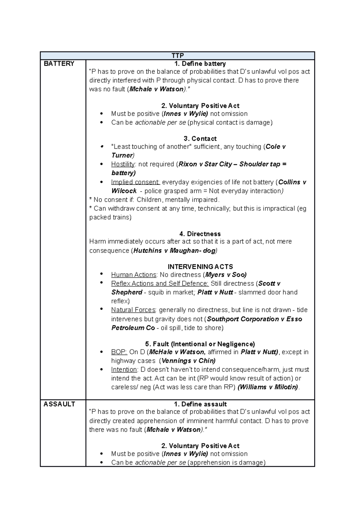 Torts Exam Notes TTP BATTERY 1. Define battery “P has to prove on the