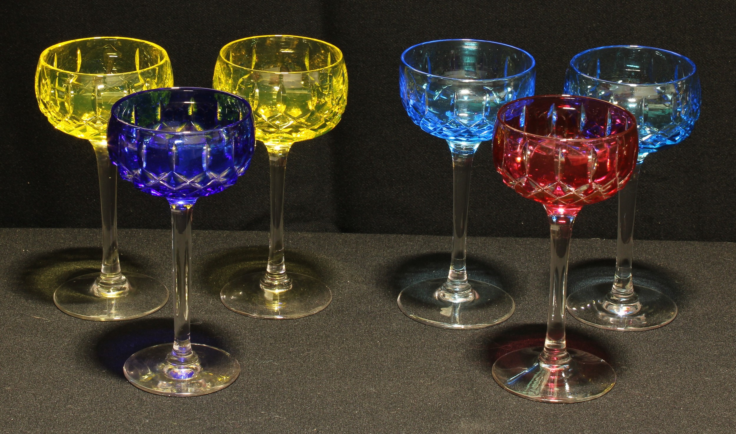 A set of six Walsh harlequin shallow wine glasses, engraved and flashed bowls in red, yellow and blu