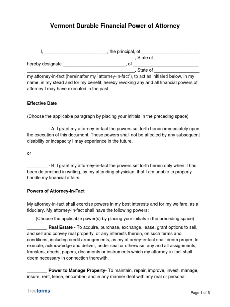 Vermont Durable Financial Power of Attorney Form PDF Power Of