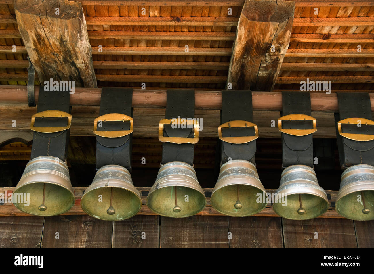 Cow Bells under roof, Bernese Oberland, Alps, Switzerland Stock Photo