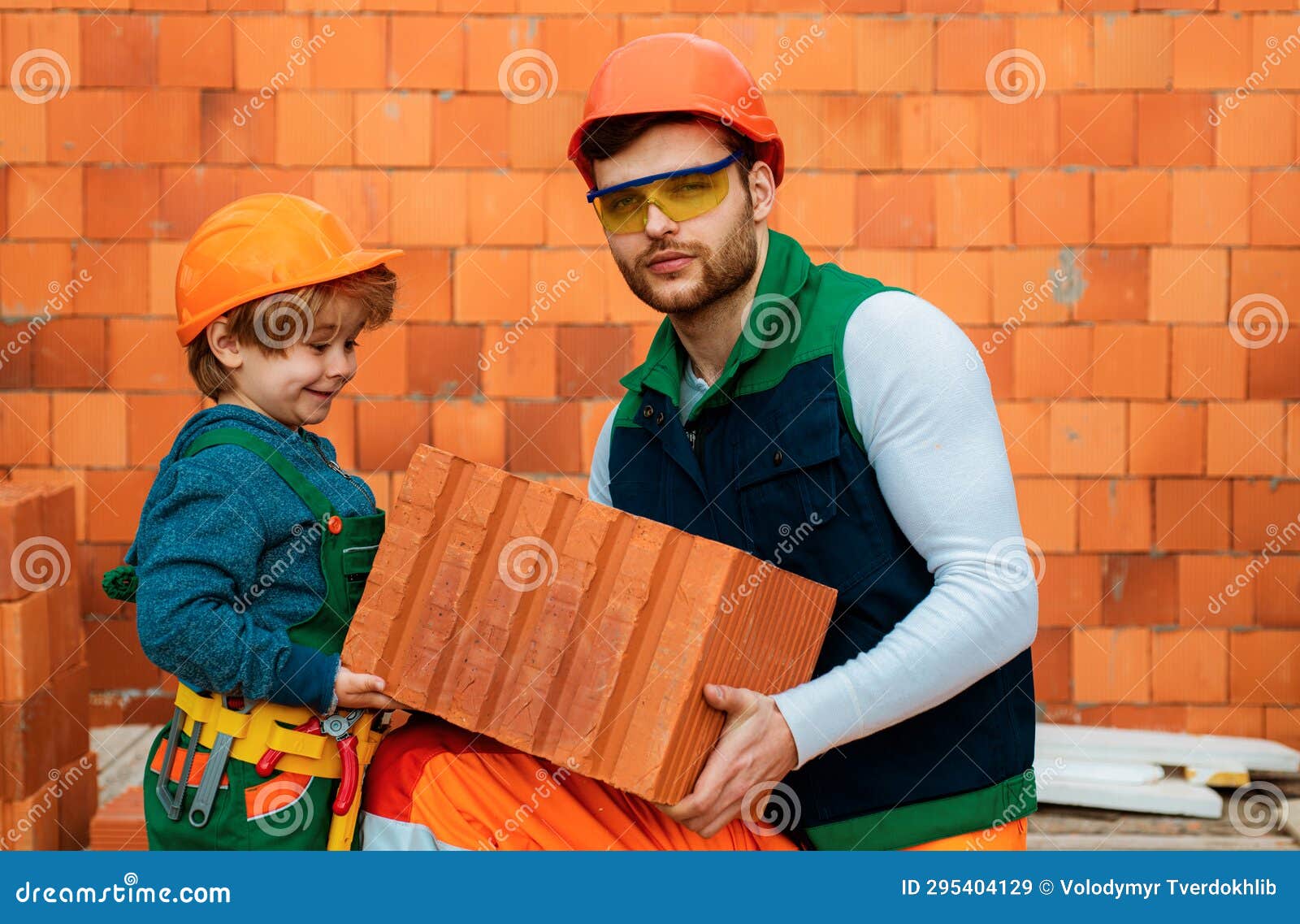Brothers Helping Concept. Bricklayer Installing Bricks on Construction