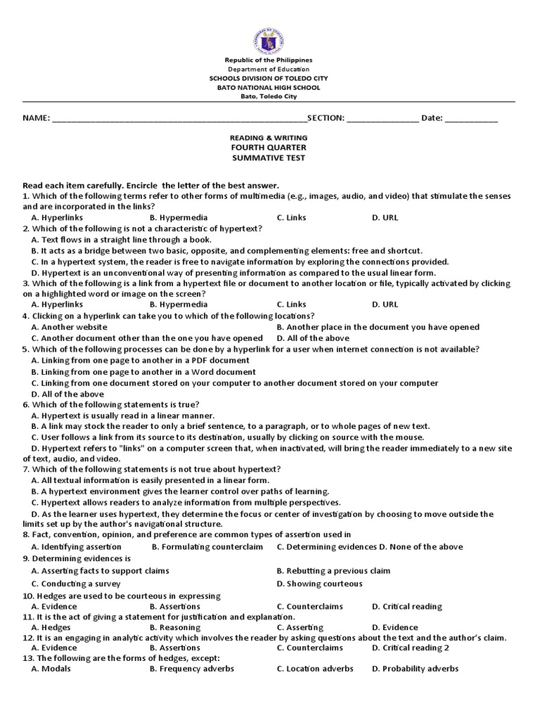 Reading and Writing Summative Test and Performance Task Jemimah D Reading And Writing Summative Test It contains 36 multiple choice questions testing knowledge of concepts like hyperlinks, hypertext, assertions, book reviews, resumes, and job applications. Bachelor of secondary education major in english (bsed) 999+ documents. 4th quarter_1st summative test in reading and writing quiz for 11th grade students. The document is a summative examination from marymount academy in san antonio that tests reading and writing. Reading And Writing Summative Test.
