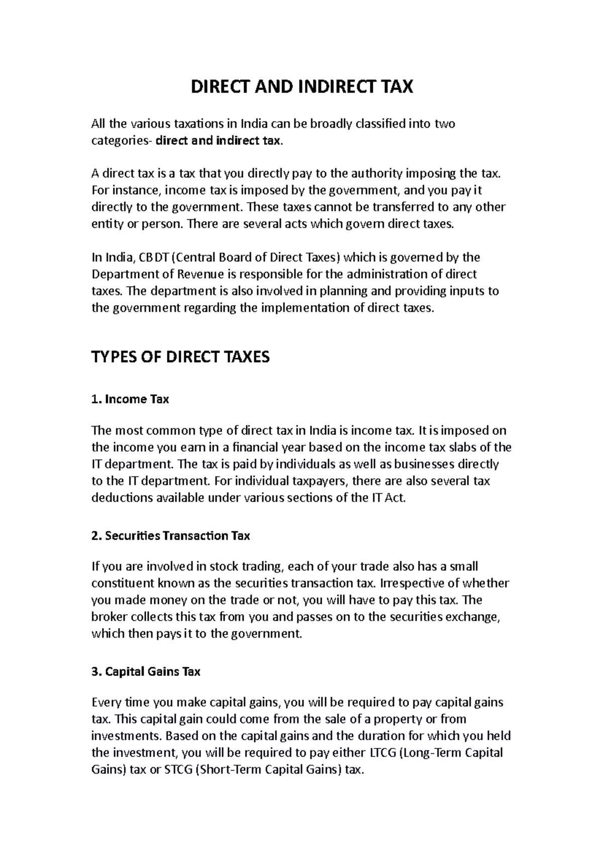 Direct AND Indirect TAX DIRECT AND INDIRECT TAX All the various taxations in India can be