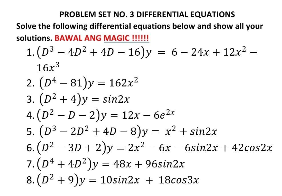 Solved PROBLEM SET NO. 3 DIFFERENTIAL EQUATIONS Solve the