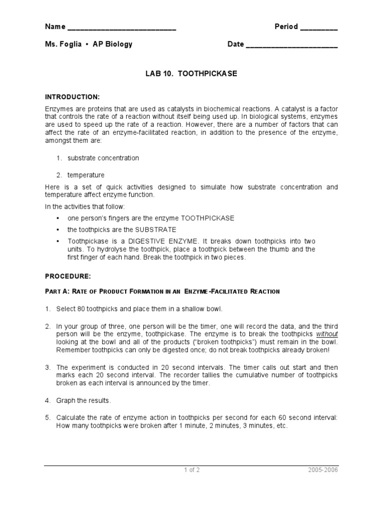 Lab 10 Toothpickase 2005 PDF Substrate (Chemistry) Enzyme