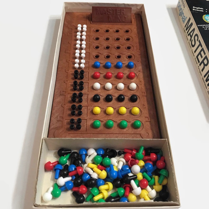 MASTERMIND Parker 1993 Classic Family Board Game Vintage Etsy Mastermind Game Board Red and white key pegs and the mastermind game. Can you crack the code in 10 moves or less? With more than 55 million units sold,. Code pegs in 6 different colors. mastermind contains the game board with storage area and code shield. hasbro gaming mastermind the classic code. the mastermind logic game brings codemaker and codebreaker. Mastermind Game Board.