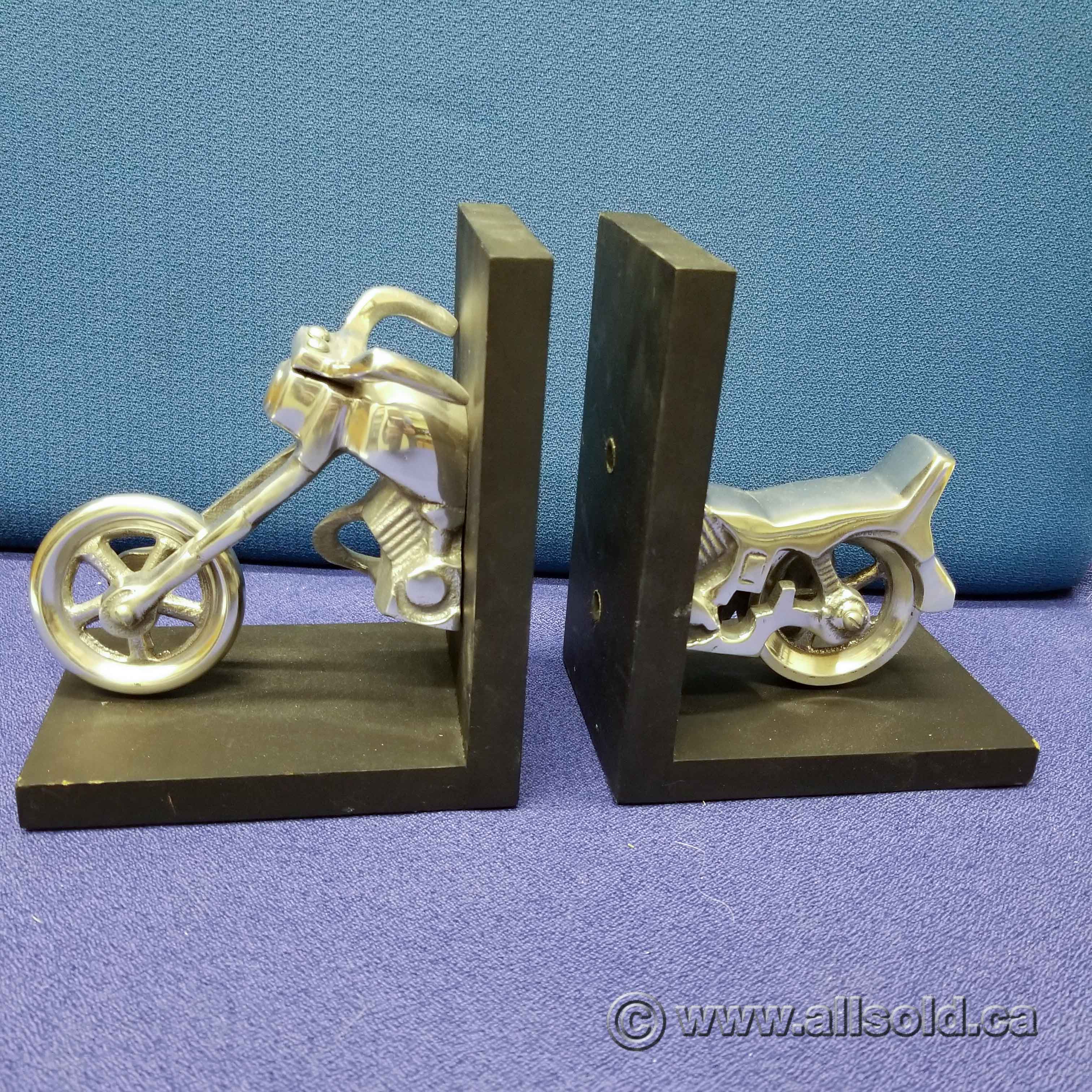 MOTOcycle Metal Works New Bookends Metal Motorcycle Bookends These office decor bookends are cast in solid aluminum and brass and fitted to substantial iron bases. This pair of durable bookends can act as focal point. Keep your books and magazine organize with this beautifully crafted and functional bookends. Check out our motorcycle bookend selection for the very best in unique or custom, handmade pieces from our nursery bookends. Metal Motorcycle Bookends.