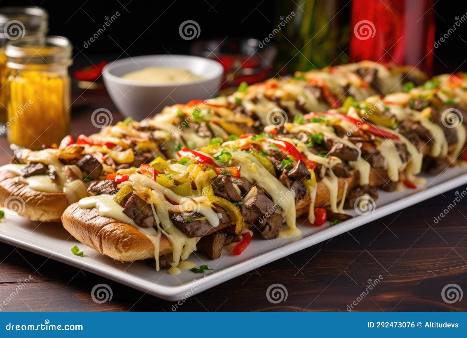 Series of Philly Cheesesteak in a Line on a Long Platter Stock Photo