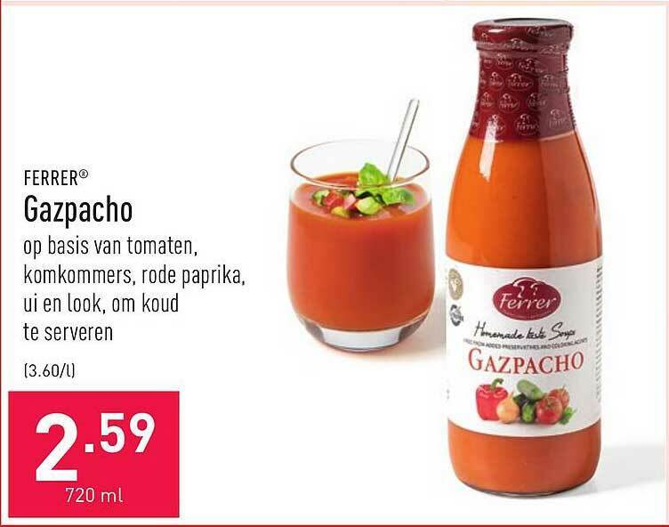 Ferrer Gazpacho promotie bij ALDI Ferrer Gazpacho We don't always have time to make gazpacho from scratch, so we keep a few of these bottles in the fridge for when we come in from gardening, or jogging, or whatever. A light, refreshing soup, it is the perfect appetiser during warm weather. En ferrer preparamos nuestro tradicional y reconocido gazpacho como tú lo harías en casa: Gazpacho is. Ferrer Gazpacho.