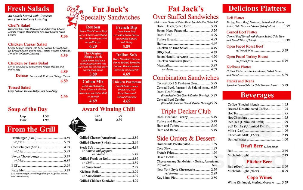 Fat Jacks Deli & Pub in Lakeland Restaurant menu and reviews Fat Jacks Deli & Pub Menu Fat jacks deli & pub. Welcome to our new website! Fat jack's deli & pub. Here you will be able to read our menu, check out our specials, and find out a little more about us and any upcoming events we may. Fat jacks deli & pub offers great prices and excellent food, including a highly recommended chef salad, french. Fat Jacks Deli & Pub Menu.