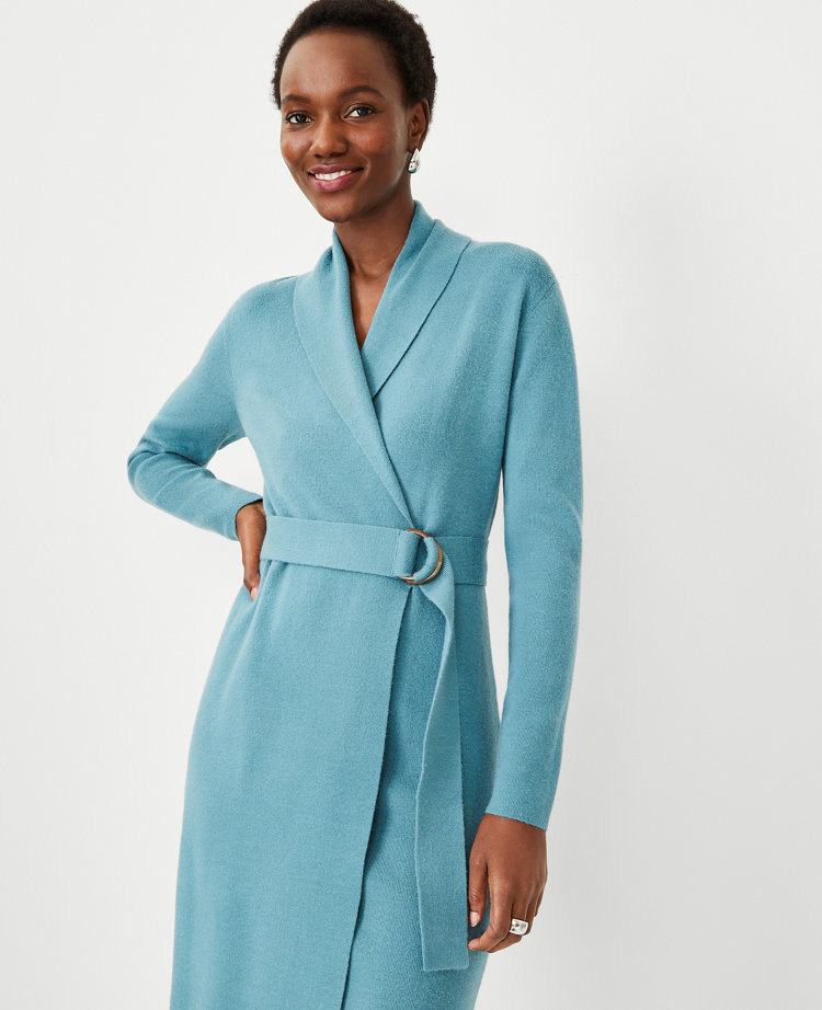 Shawl Collar Belted Wrap Sweater Dress