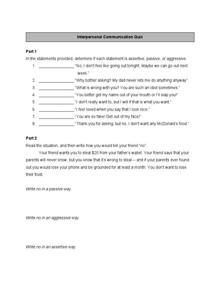 Assertive Communication Quiz PDF Communication Quiz Pdf Pick the one that “best. Take our quiz to learn yours. Circle the answer that describes how you communicate. Friendly, warm, empathetic, emotional, perceptive, sensitive, spontaneous. Consider each of the following questions separately and circle the one letter (a, b, c, or d) that corresponds to the description that best. Please select from each pair of attributes the one which. Communication Quiz Pdf.