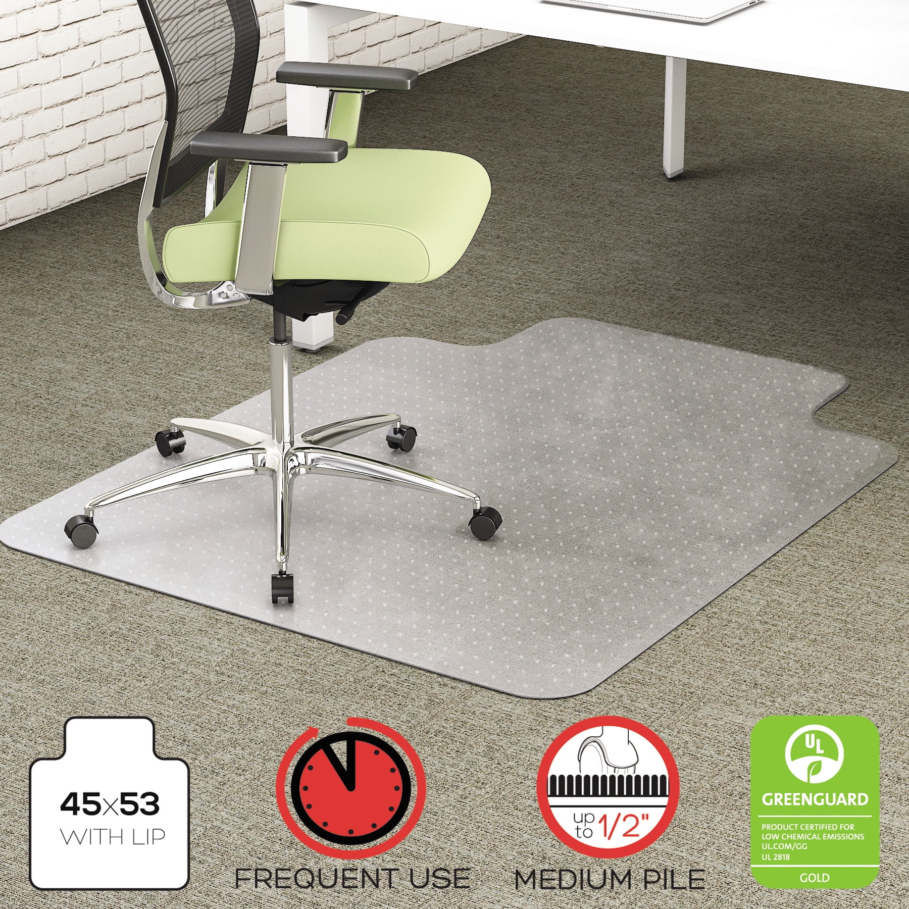 Chair Mat 45 X 53 This chair mat for hardwood floor protects floors from scratching caused by chair legs or rolling casters. All day support for everyday office use. Lipped shape protects medium pile carpet up to 3/4 in. Es robbins professional series clear chair mat for carpet in 45 in. Protects medium pile carpet up to 3/4 thick (including padding depth) from chair caster. Chair Mat 45 X 53.