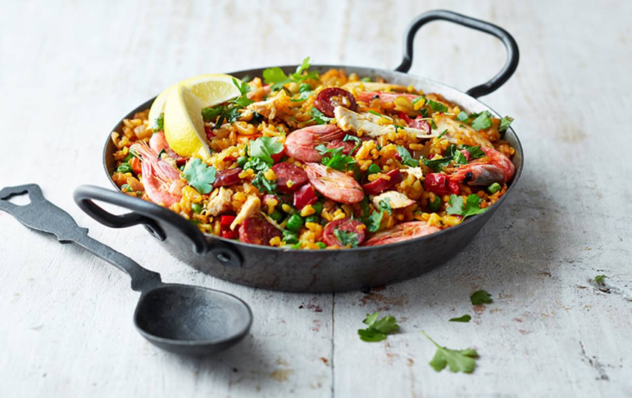 Easy baked paella with chorizo, chicken and prawns Kallo