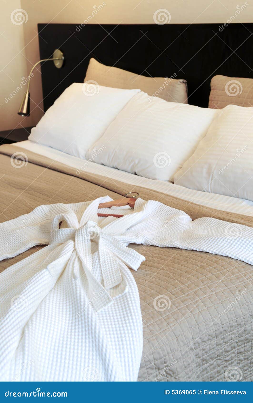 Hotel bed with bathrobe stock image. Image of 5369065