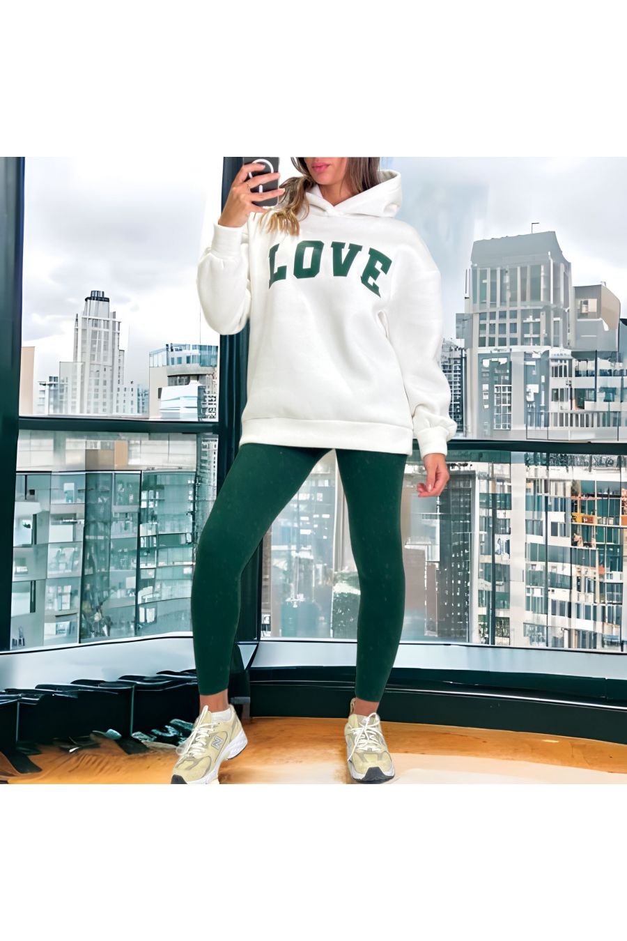 White and green sweatshirt and leggings set with LOVE writing