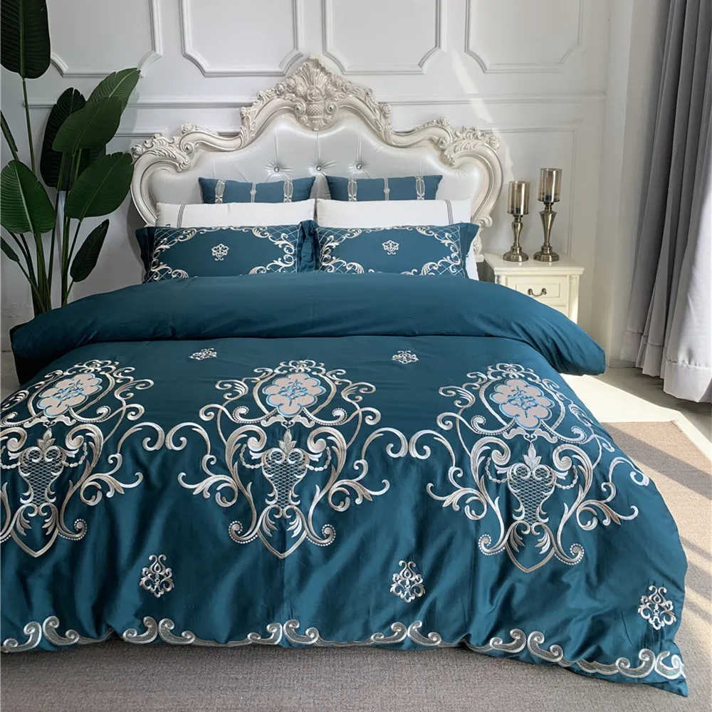 100 Cotton sateen bedding sets 4 piece delicate embroidery bed sheets teal duvet cover dark