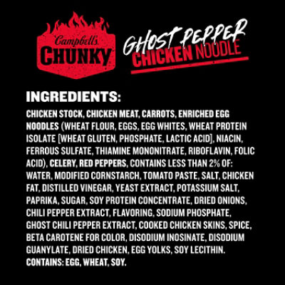 Campbell's Chunky Ghost Pepper Chicken Noodle Soup Shop Soups & chili Campbell's Soup Ghost Pepper Chunky ghost pepper chicken noodle soup. Campbell's new ghost pepper chicken noodle soup is so spicy, you have to sign a waiver to try. The limited time soup offering is the hottest entrant in the spicy line introduced by chunky in 2022 that includes spicy chicken noodle, spicy steak and potato, spicy sirloin burger and spicy chicken and sausage gumbo.. Campbell's Soup Ghost Pepper.